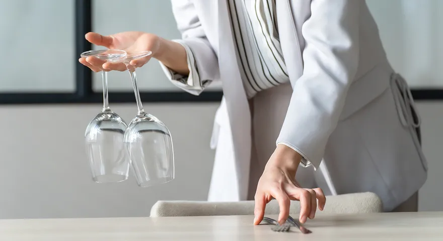 お皿やグラスを下げ、テーブルクロスをはがし、机や床の清掃を行います。